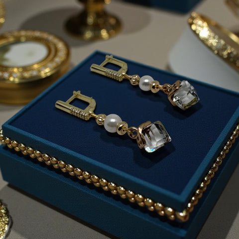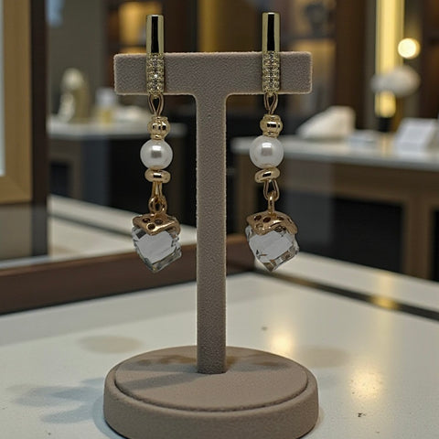 Boucles d’oreilles – Cristal sculpté et perle, monture plaqué or