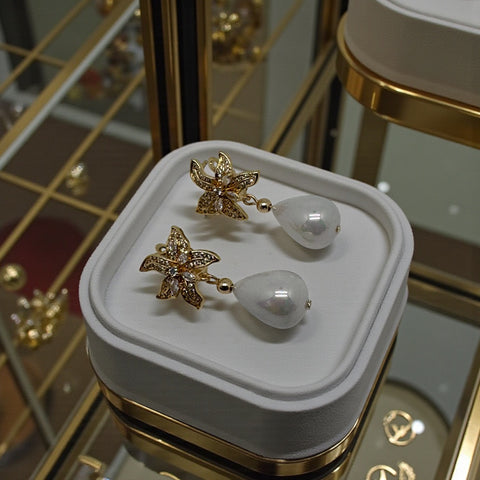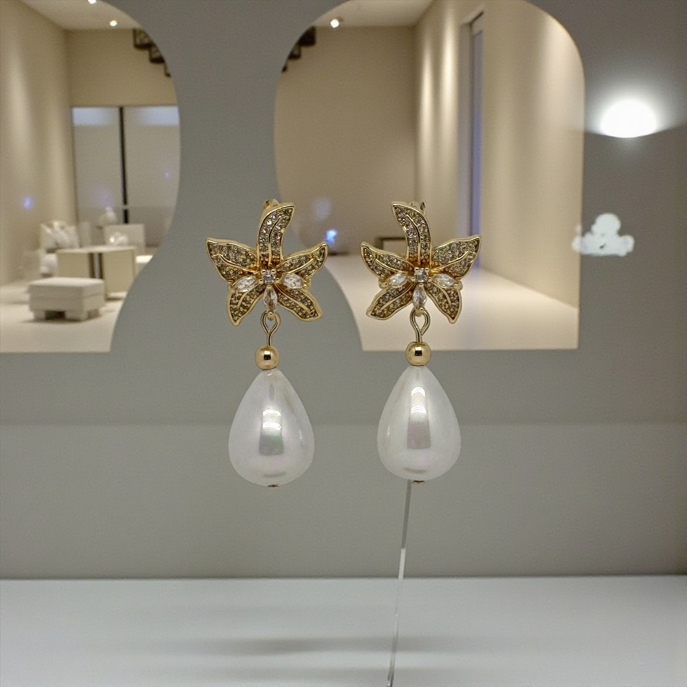 Sculptées comme un bijou de poésie, ces boucles d’oreilles d’exception célèbrent la rencontre entre la nature et le raffinement. Leur délicate monture florale plaquée or, sublimée de strass scintillants et de zirconium lumineux, enlace avec grâce une perle de coquillages en forme de poire, symbole de féminité et d’harmonie.