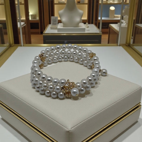 Laissez vous séduire par l’harmonie parfaite entre raffinement et bien-être. Ce bracelet manchette triple rang à mémoire de forme épouse naturellement le poignet pour un confort absolu, tout en offrant une allure chic et contemporaine. Composé de perles de 6 mm délicatement mises en valeur par un intercalaire plaqué or, il devient un bijou à la fois lumineux, féminin et intemporel.
