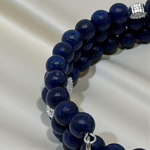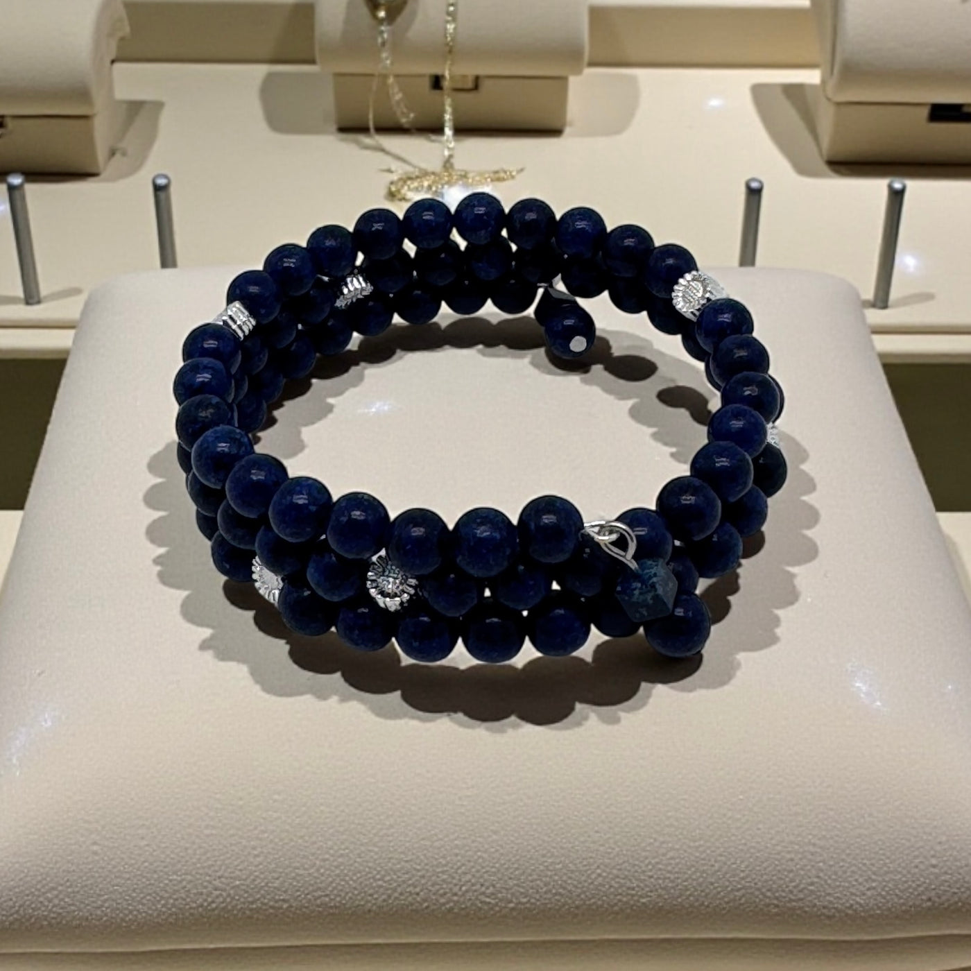 Laissez vous séduire par ce bracelet manchette à mémoire de forme en lapis-lazuli, sublimé par un intercalaire en argent. À la fois souple et structuré, il épouse naturellement le poignet pour un confort parfait et une allure résolument chic, du quotidien aux grandes occasions.