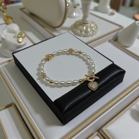 Bracelet en perles d’eau douce avec fermoir cœur plaqué or et strass – Douceur et raffinement - longueur 17 cm