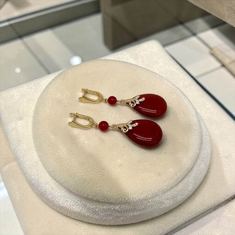 Au cœur de la composition, une cornaline de 6 mm, au rouge profond et vibrant, capte la lumière et évoque la chaleur, l’énergie et la féminité affirmée. Elle accompagne avec grâce un somptueux pendentif en calcédoine, taillé en goutte, dont la douceur satinée contraste délicatement avec l’éclat du métal doré.