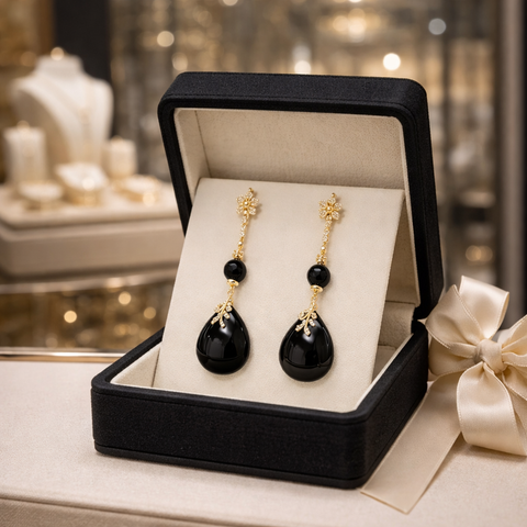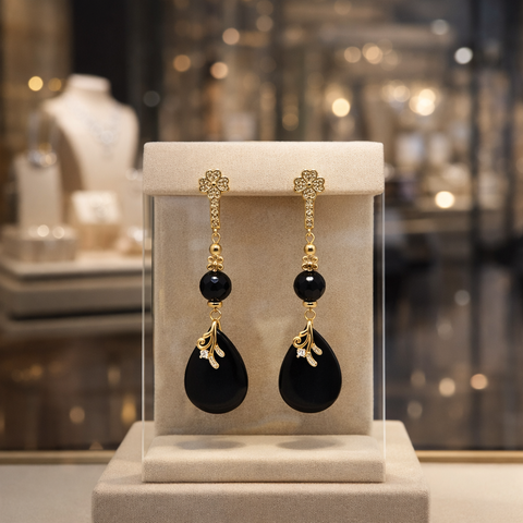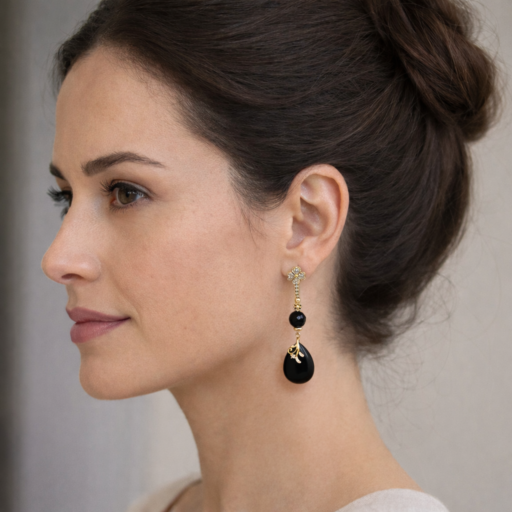D’une longueur élancée d’environ 75 mm, elles offrent une silhouette raffinée et féminine qui attire immédiatement le regard. Leur design harmonieux associe la pureté sombre et brillante de l’obsidienne à la chaleur lumineuse des éléments plaqués or, créant un contraste d’une grande sophistication.