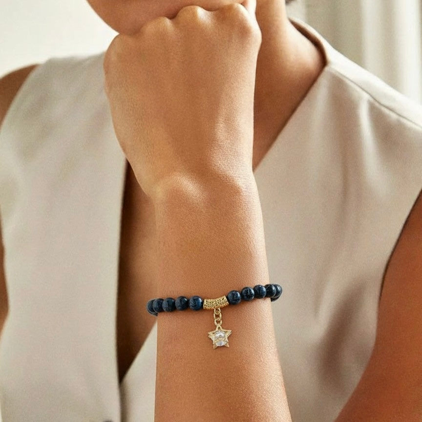 En son centre, une breloque étoile en cristal plaqué or apporte une touche de raffinement et de lumière, symbole d’inspiration et de guidance.