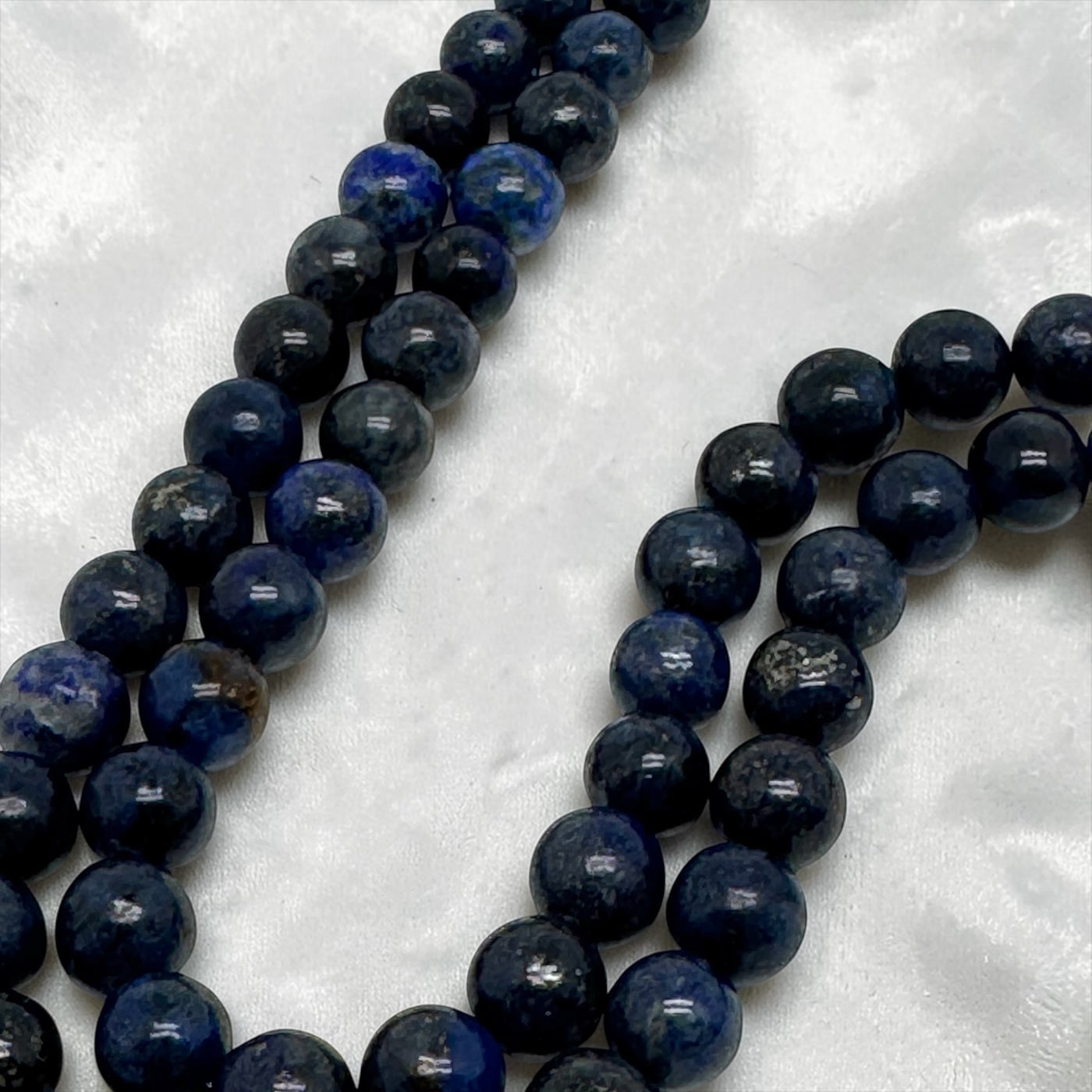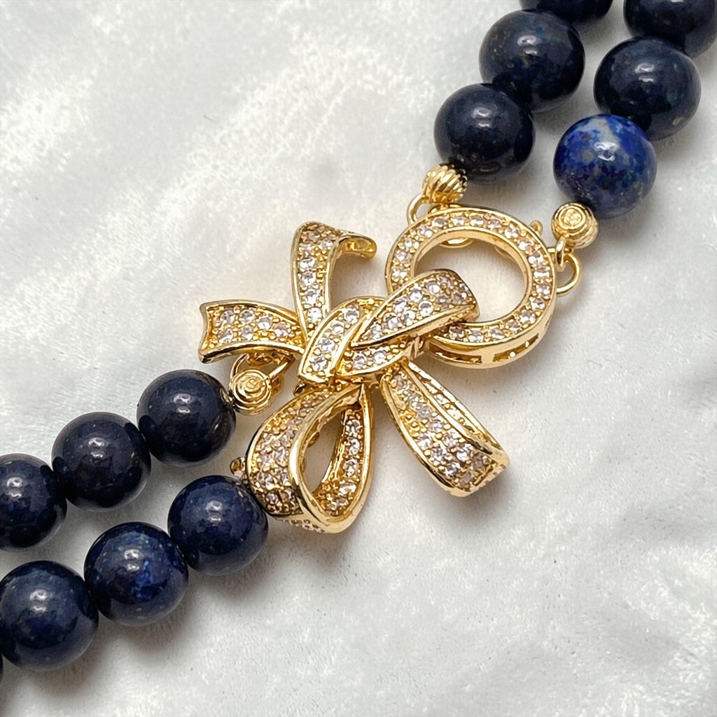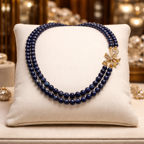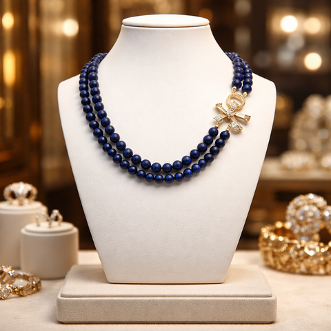 Ce somptueux collier double rang révèle toute la profondeur envoûtante du lapis-lazuli, pierre mythique aux nuances bleu nuit, délicatement marbrée de reflets dorés naturels. Chaque perle de 8 mm, soigneusement sélectionnée, capte la lumière avec subtilité, créant un jeu d’éclat sophistiqué et magnétique.