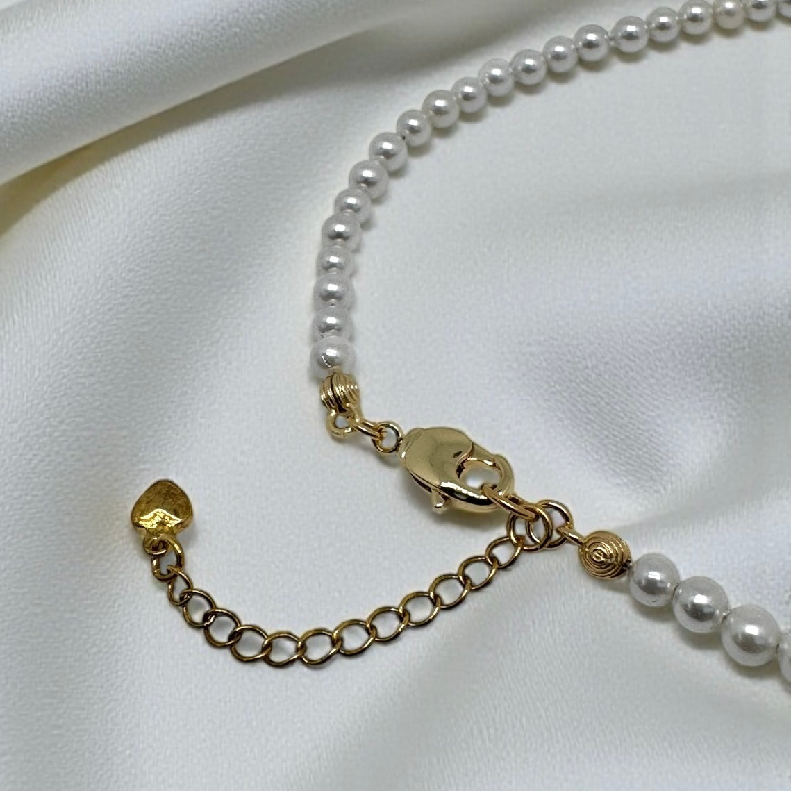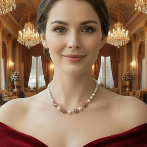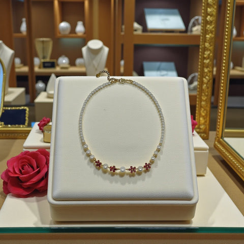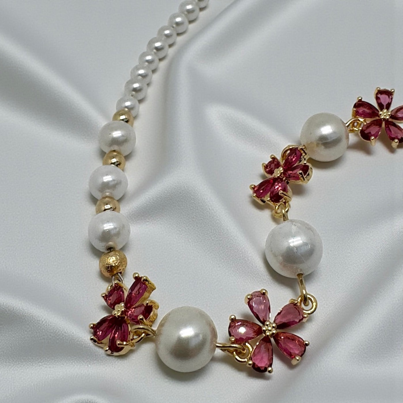 Élégant et résolument raffiné, ce collier tour du cou sublime la délicatesse des perles de coquillages de 4 mm, choisies pour leur éclat doux et naturel. Leur blancheur soyeuse crée une harmonie parfaite avec de fines fleurs plaquées or, serties de zirconiums rouges étincelants, véritables touches de passion et de lumière au cœur du bijou.
