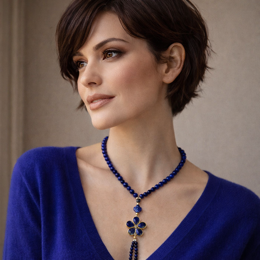 Au centre du collier, un pendentif remarquable attire le regard : une fleur délicate à cinq pétales, entièrement réalisée en lapis-lazuli, dont chaque pétale est finement cerclé de laiton plaqué or. Cette monture dorée sublime la profondeur du bleu de la pierre et crée un contraste précieux et lumineux. La fleur, symbole de beauté et d’harmonie, devient ici l’élément signature du bijou.