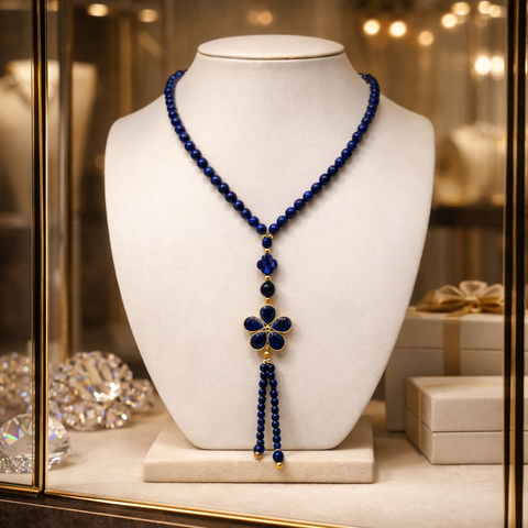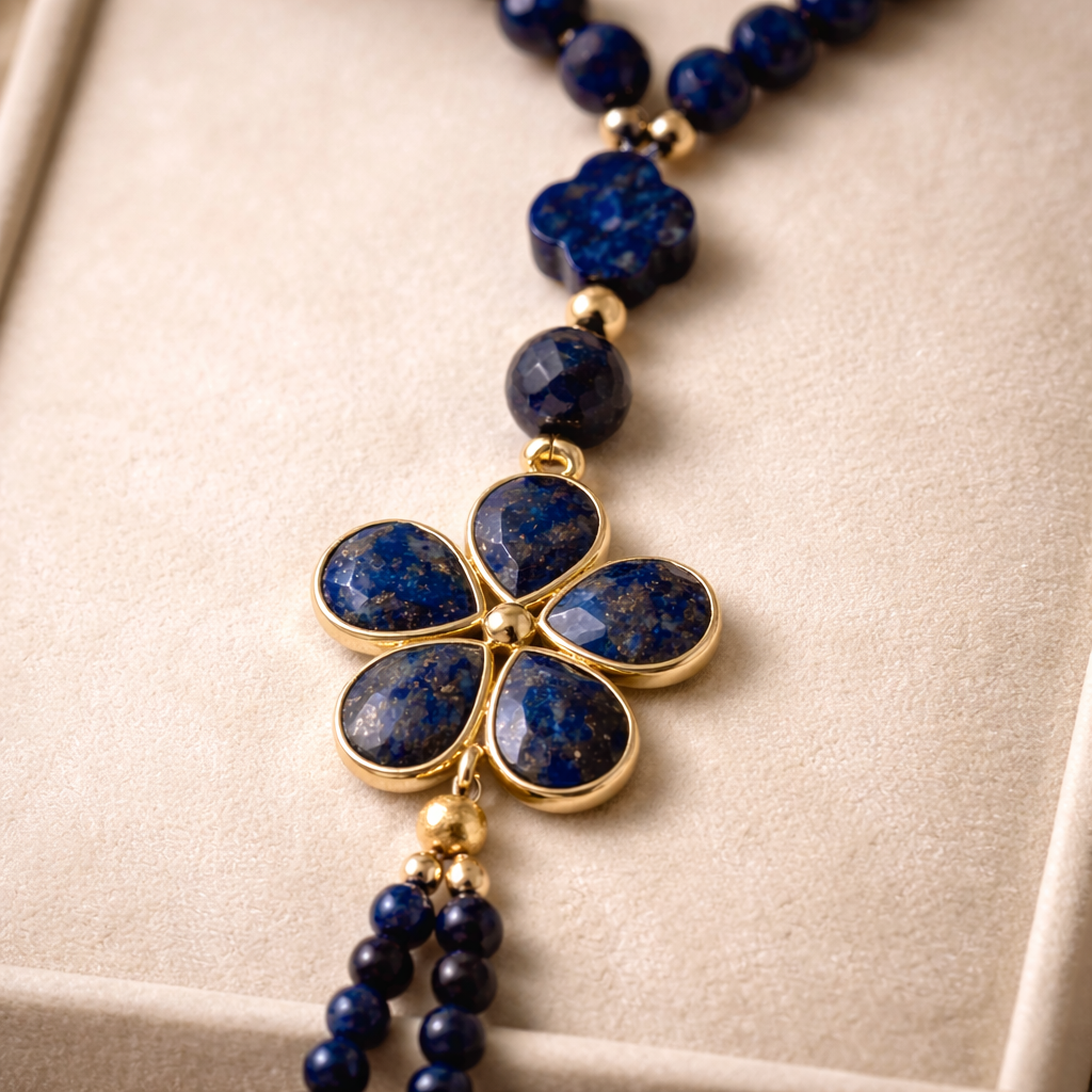 L’ensemble forme un collier à l’élégance intemporelle, où la noblesse du lapis-lazuli rencontre la chaleur du plaqué or pour un résultat à la fois sophistiqué et poétique.