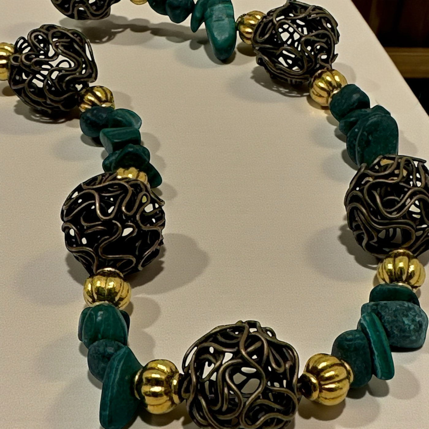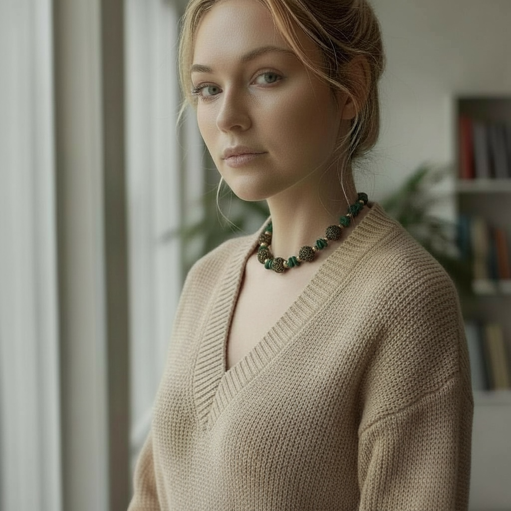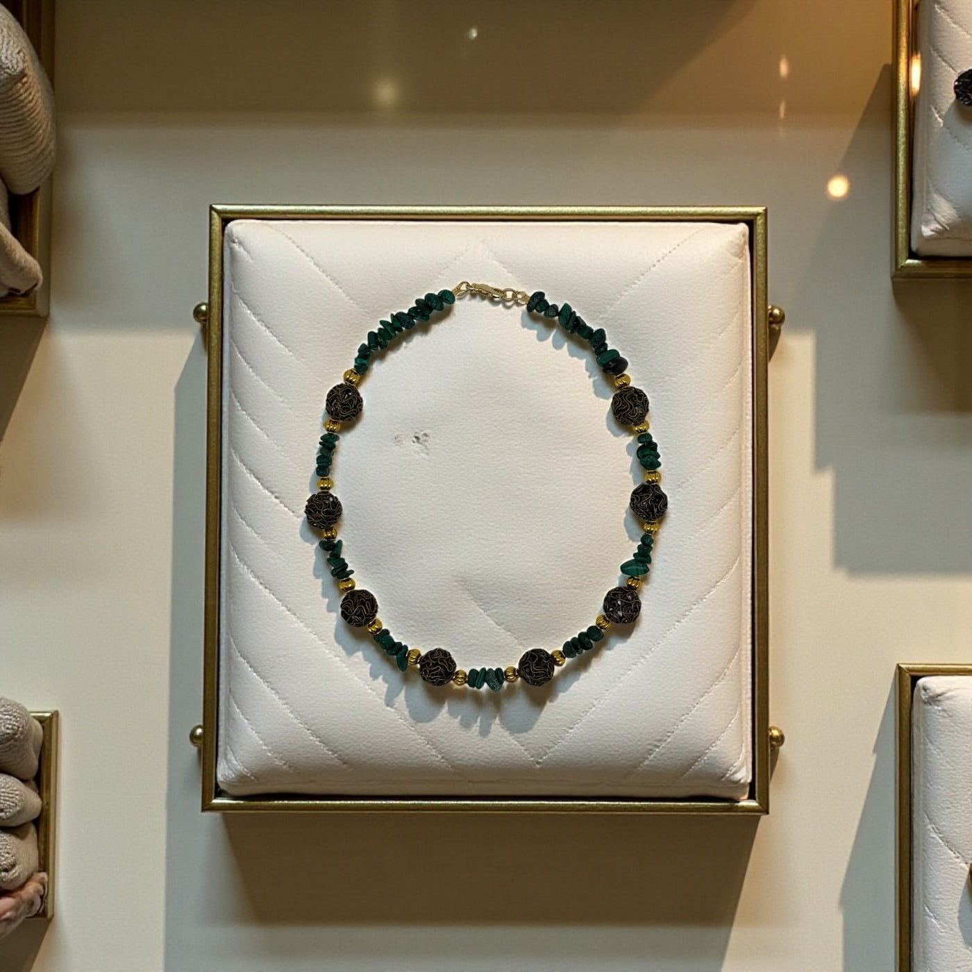Laissez vous séduire par l’intensité verte et vibrante de ce collier ras du cou en malachite naturelle, une création qui allie délicatesse, protection et élégance contemporaine. Chaque pierre révèle ses stries uniques, véritables empreintes de la nature, et s’harmonise avec des perles ajourées façonnées en fil de cuivre, dont la finesse apporte relief et légèreté.