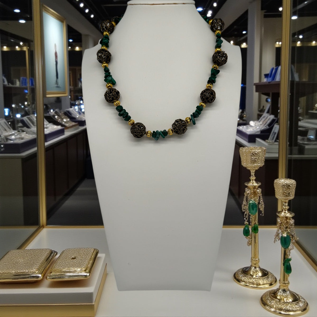 Les touches de lumière sont assurées par de subtiles perles et intercalaires plaqué or, qui soulignent l’éclat profond de la malachite et confèrent au collier une allure précieuse tout en restant moderne et épurée.