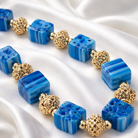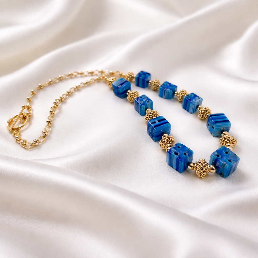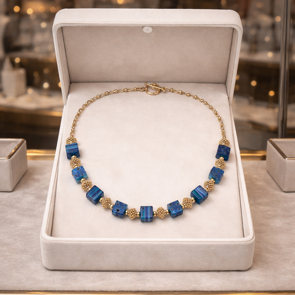 Réalisé à partir de perles cubiques Millefiori – dites “1000 fleurs”, ce collier séduit par son graphisme raffiné et sa richesse visuelle. Les perles sont harmonieusement rythmées par des intercalaires ciselés plaqué or, apportant relief, lumière et élégance à l’ensemble. Une chaîne plaquée or vient parfaire la composition, offrant une finition lumineuse et luxueuse.