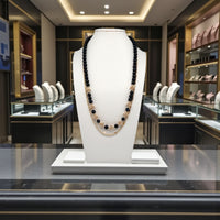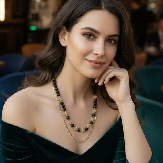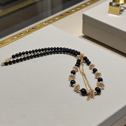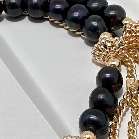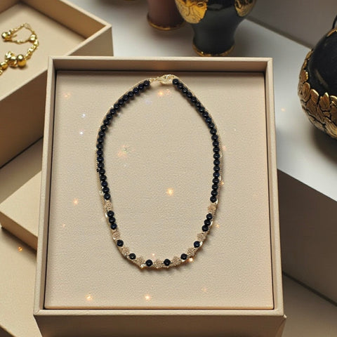 Chaque perle de 8 mm, soigneusement sélectionnée, révèle des reflets nocturnes subtils, oscillant entre mystère et lumière, comme un ciel étoilé capturé dans la matière.