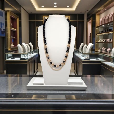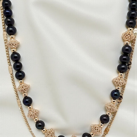 Les intercalaires en plaqué or ciselé, délicatement travaillés, rythment le collier avec caractère et sophistication, tandis que la chaîne en plaqué or apporte une touche contemporaine et précieuse à l’ensemble. Sa longueur de 54 cm lui permet de se poser harmonieusement sur le décolleté, seul ou en superposition, pour une allure naturellement luxueuse.