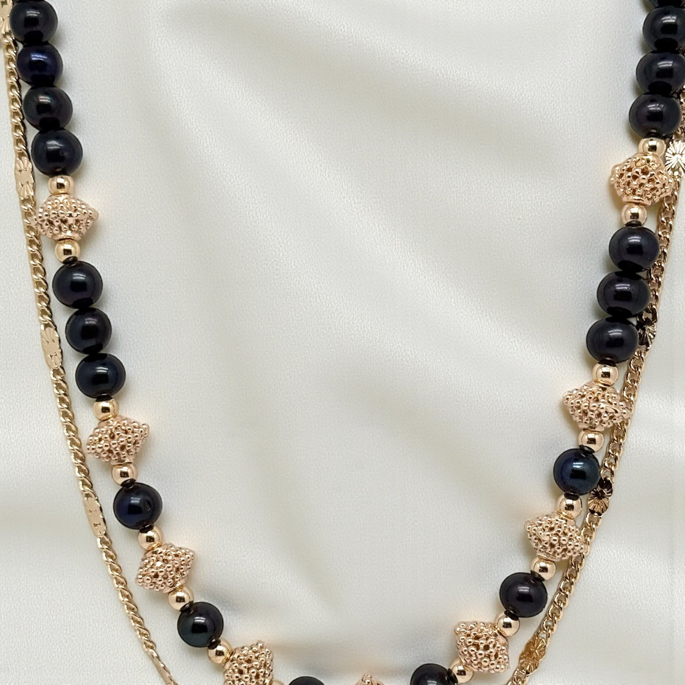 Laissez vous séduire par l’élégance profonde de ce collier en perles d’eau douce bleu nuit, une création au raffinement magnétique.