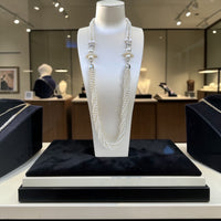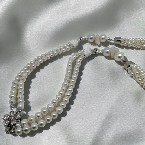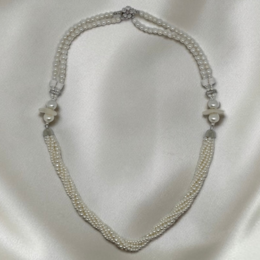 Sublime sautoir de 70 cm, il incarne l’élégance intemporelle et la douceur lumineuse des perles. Sa composition raffinée mêle de délicates perles de coquillage de 6 mm à des perles fantaisie subtilement torsadées, créant un jeu de reliefs et de textures d’une grande sophistication.