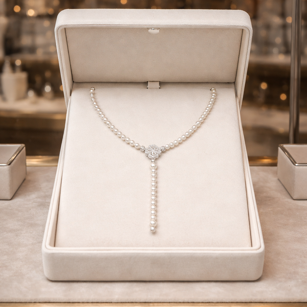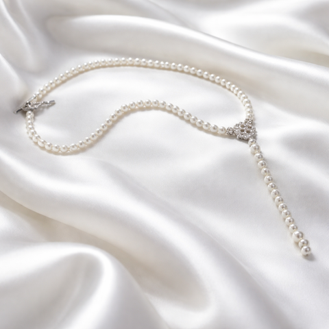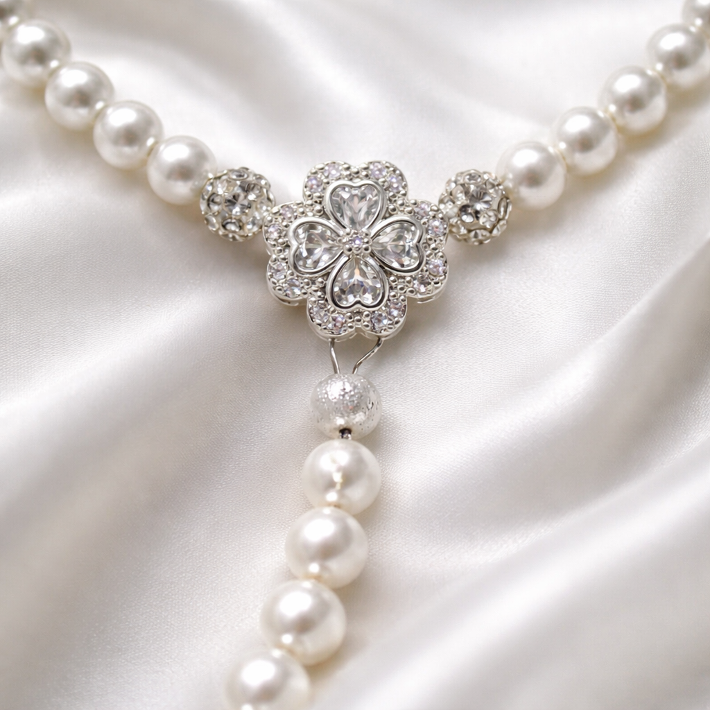 D’une élégance délicate et intemporelle, il est réalisé en perles de coquillages de 4 mm, sélectionnées pour leur éclat doux et soyeux. Le collier se ferme par un fermoir en argent rhodié, subtilement orné de strass, apportant une touche de lumière raffinée.