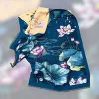 La douceur incomparable du cachemire... les couleurs chaudes, les ornements aux motifs de nénuphars font de ce grand foulard étole une véritable merveille