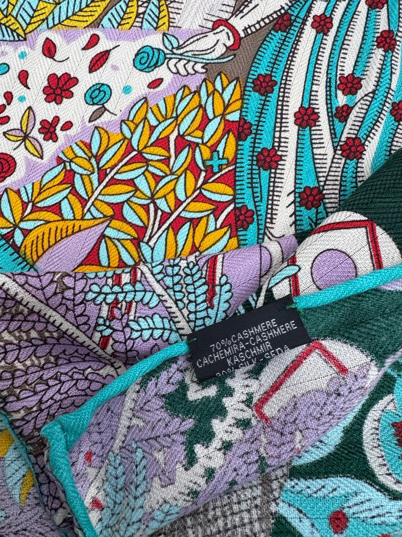 Tissé dans une fibre de cachemire d’exception, issue des hauts plateaux de l’Himalaya où paissent les célèbres chèvres Capra hircus, ce foulard se distingue par sa texture incroyablement douce et sa chaleur naturelle. Associée à la soie, cette matière noble lui confère un toucher fluide, une légèreté aérienne et une brillance subtile.