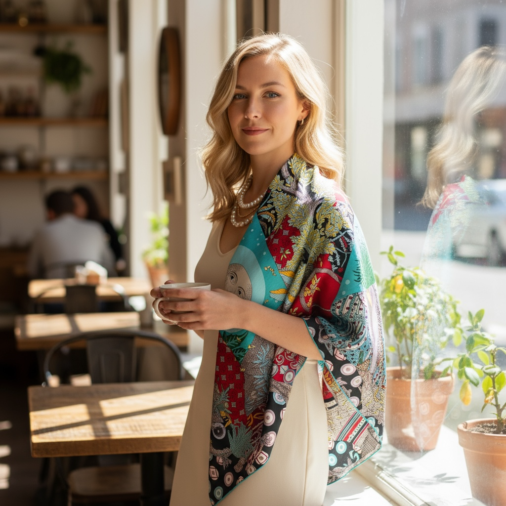Avec ses dimensions généreuses de 135 × 135 cm, il se porte de mille façons : en étole, en châle, noué autour du cou ou posé sur les épaules, selon vos envies et les saisons.