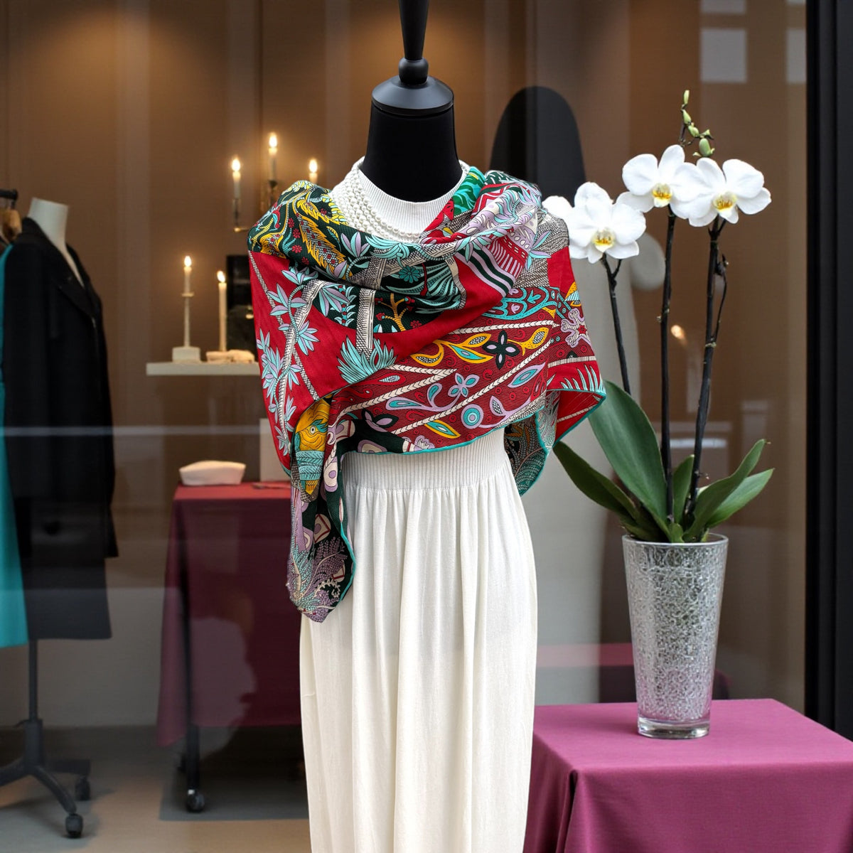 Offrez-vous l’élégance intemporelle de ce somptueux foulard en cachemire et soie, une alliance parfaite entre douceur, légèreté et raffinement. Ses couleurs chaudes et chatoyantes évoquent les lumières d’un coucher de soleil oriental, apportant éclat et chaleur à toutes vos tenues, qu’elles soient habillées ou décontractées.