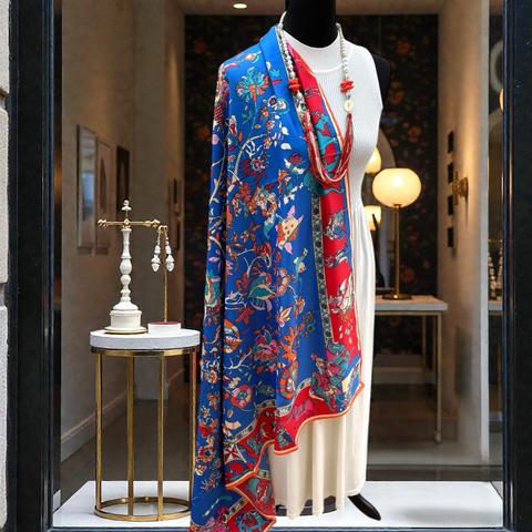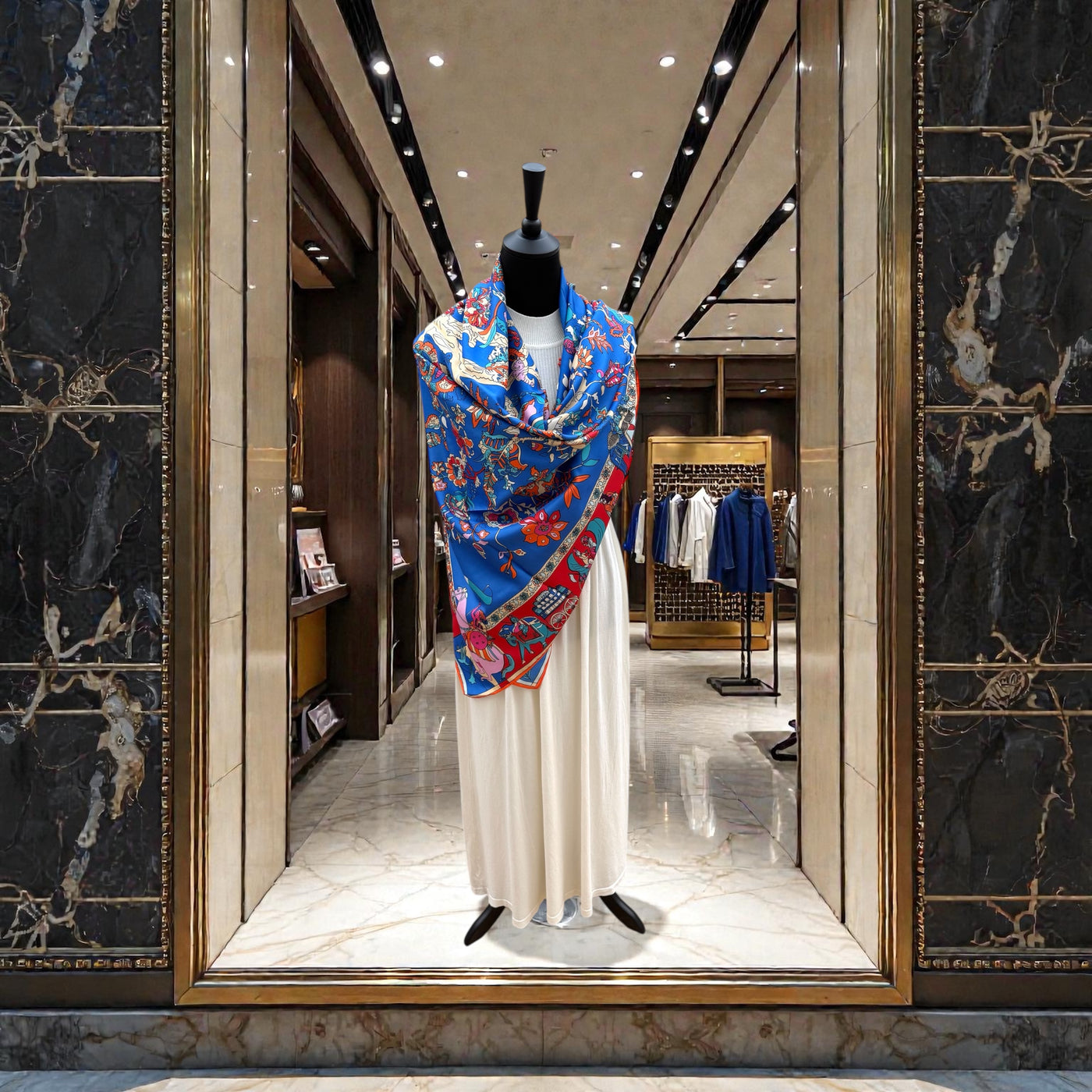 Avec ses dimensions généreuses de 135 × 135 cm, il se porte de multiples façons : en étole élégante, en accessoire de caractère ou même en pièce décorative murale. Chaque pli révèle la fluidité royale de la soie et la force symbolique de son motif.