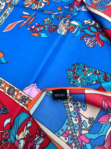 Confectionné dans une soie d’origine naturelle, matière précieuse prisée depuis des millénaires pour sa douceur, sa légèreté et son éclat inégalé, ce carré rend hommage à une tradition née sur les routes mythiques de l’Orient, où la soie était jadis considérée comme un trésor impérial.