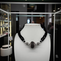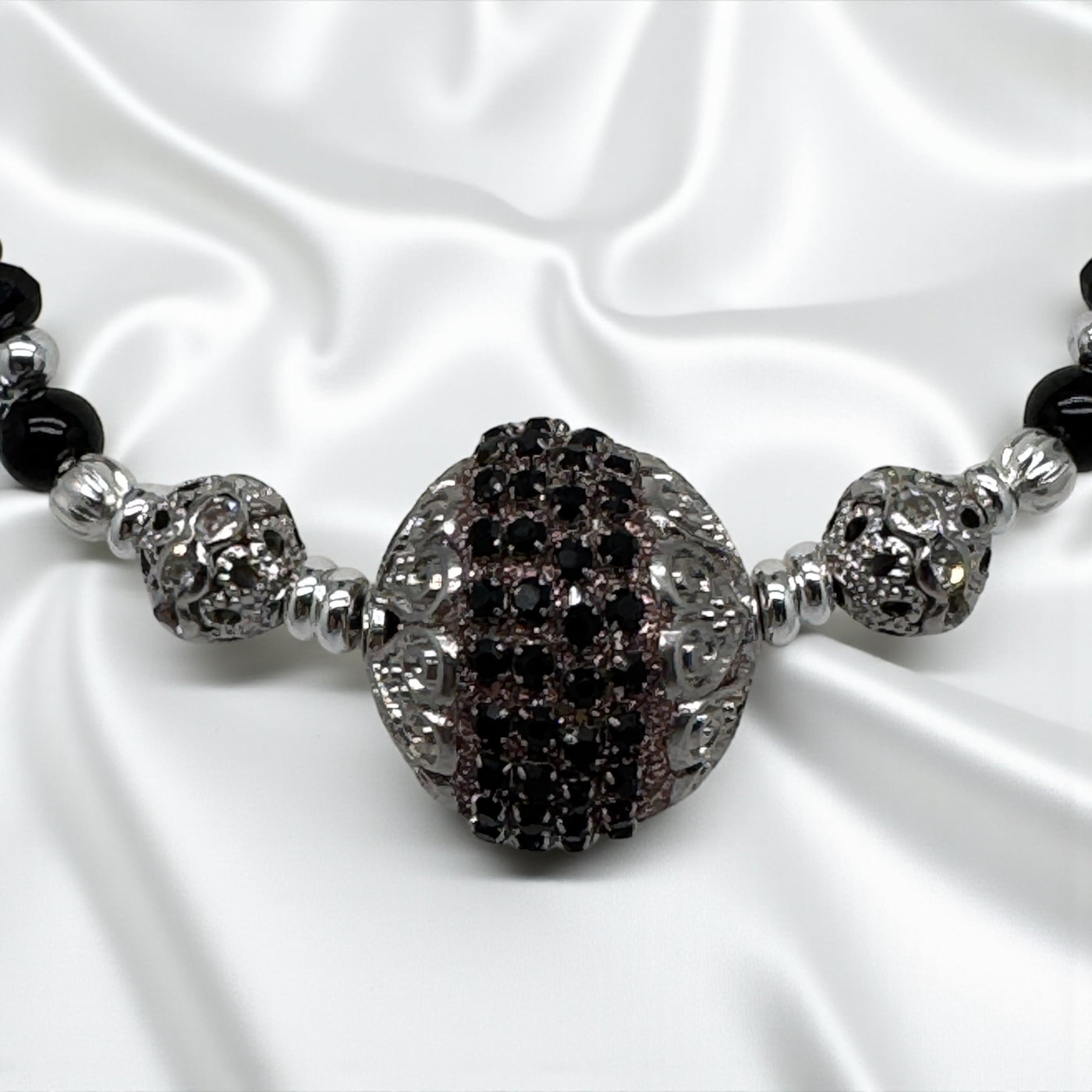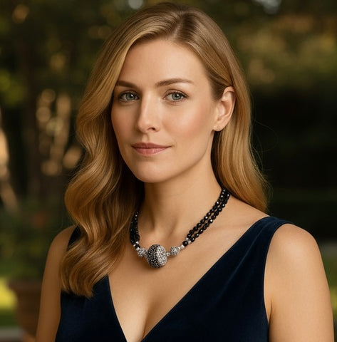 Sous la lumière, les éclats du verre taillé dansent comme des gouttes de rosée figées. Deux rangs se croisent, s’entrelacent, et conduisent le regard vers une grande perle centrale, pièce maîtresse façonnée à la main en terre indonésienne.