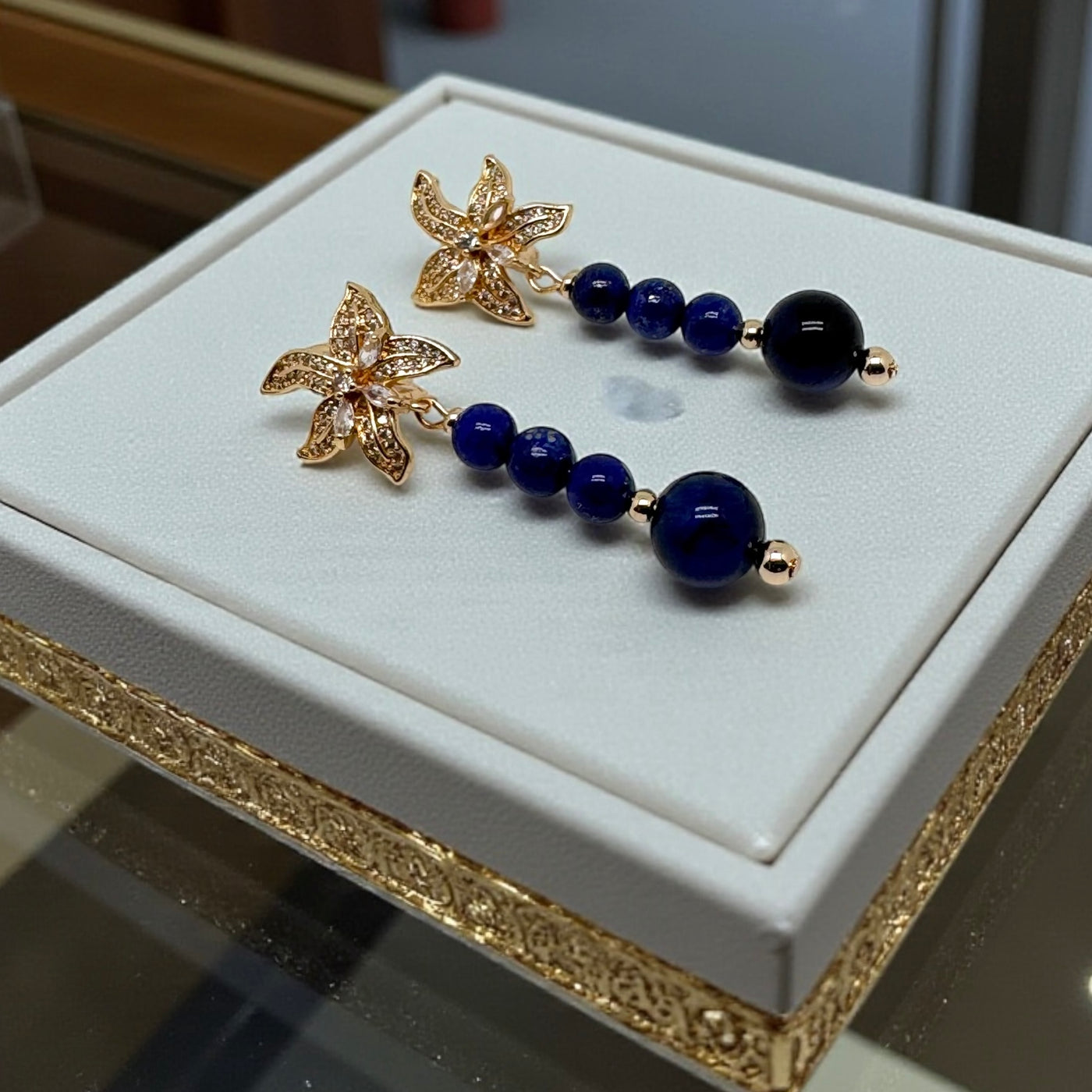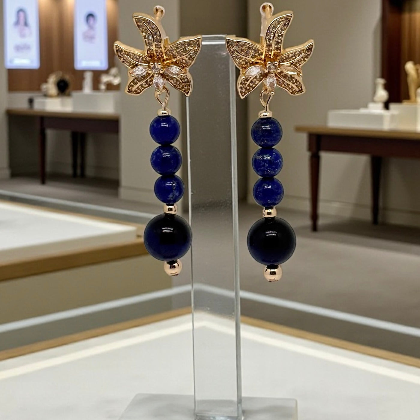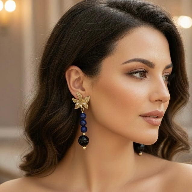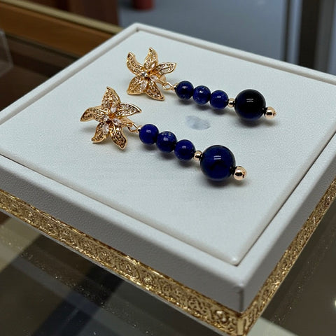 D’une longueur élégante de 6 cm, cette paire associe avec raffinement des perles de lapis-lazuli de 6 mm, à la profondeur bleue intense et veinée d’or, à une perle centrale de 10 mm en œil de tigre bleu, pierre rare et captivante aux reflets soyeux. L’ensemble crée un jeu de contrastes subtil entre mystère, lumière et sophistication.