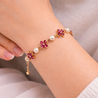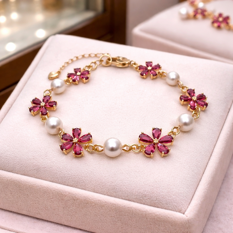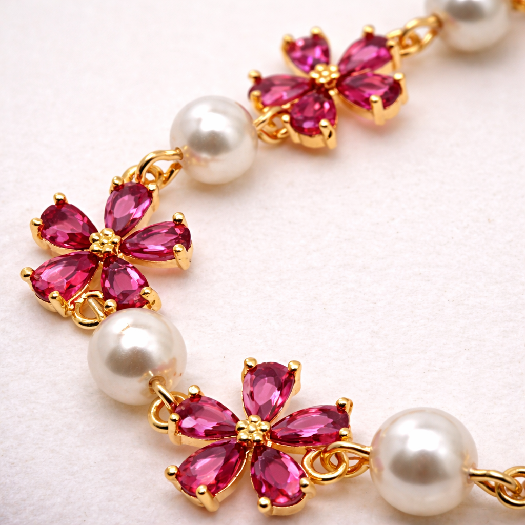 Ce bijou raffiné associe de sublimes perles de coquillage nacrées à de magnifiques fleurs serties de cristaux rouges étincelants, délicatement montées sur une base plaquée or. Chaque fleur, finement travaillée, dévoile cinq pétales lumineux qui captent la lumière avec intensité, créant un contraste somptueux entre l’éclat profond du rouge et la douceur satinée des perles.