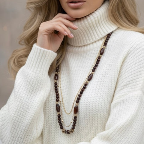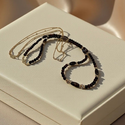 Ce bijou d’exception allie la force minérale et le raffinement du doré. Confectionné avec des perles d’Œil du Tigre rouge (ou Œil de Taureau) de 6 mm et des perles allongées en Agate, ce collier se distingue par sa double chaîne en plaqué or, amovible selon vos envies.