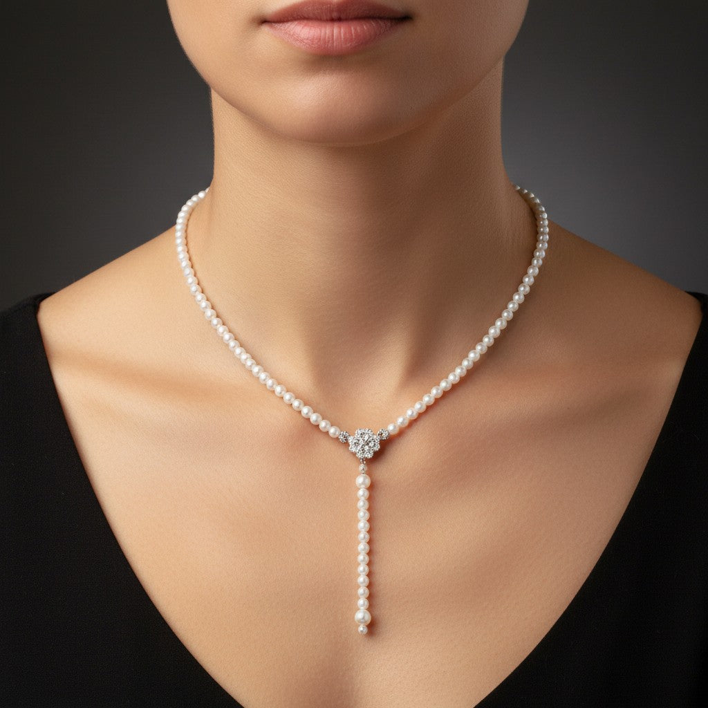 D’une élégance délicate et intemporelle, il est réalisé en perles de coquillages de 4 mm, sélectionnées pour leur éclat doux et soyeux. Le collier se ferme par un fermoir en argent rhodié, subtilement orné de strass, apportant une touche de lumière raffinée.