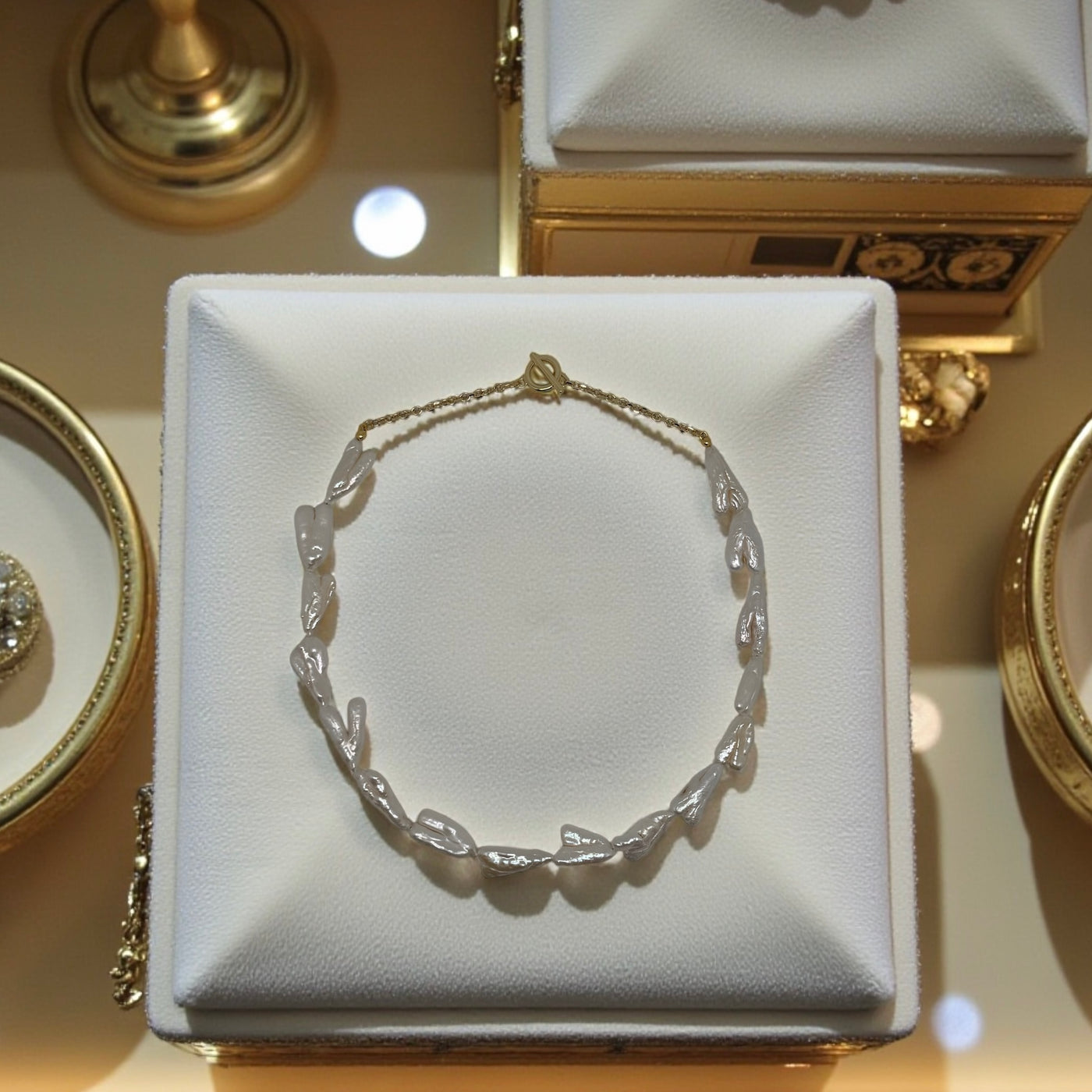 Affirmez votre style avec ce collier de perles baroques aux formes résolument modernes, montées sur une fine chaîne plaquée or au tombé délicat et lumineux. Chaque perle, libre dans sa forme, capte la lumière avec subtilité et apporte à ce bijou une élégance contemporaine, à la fois audacieuse et raffinée.