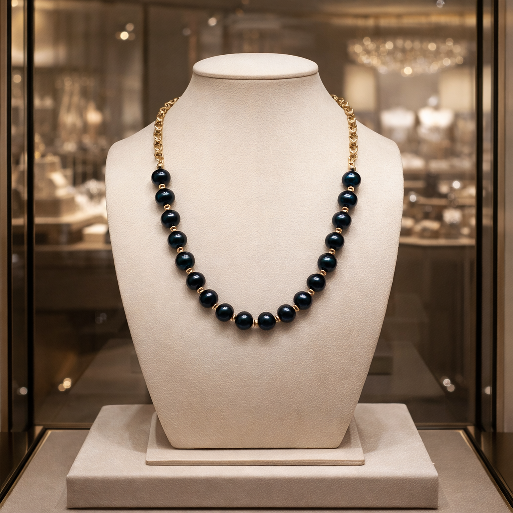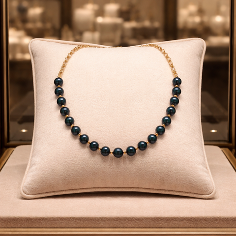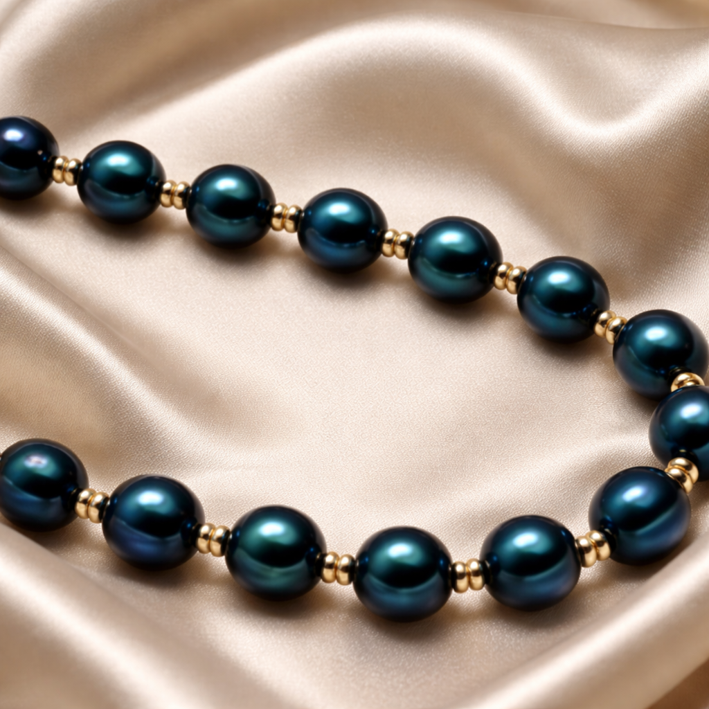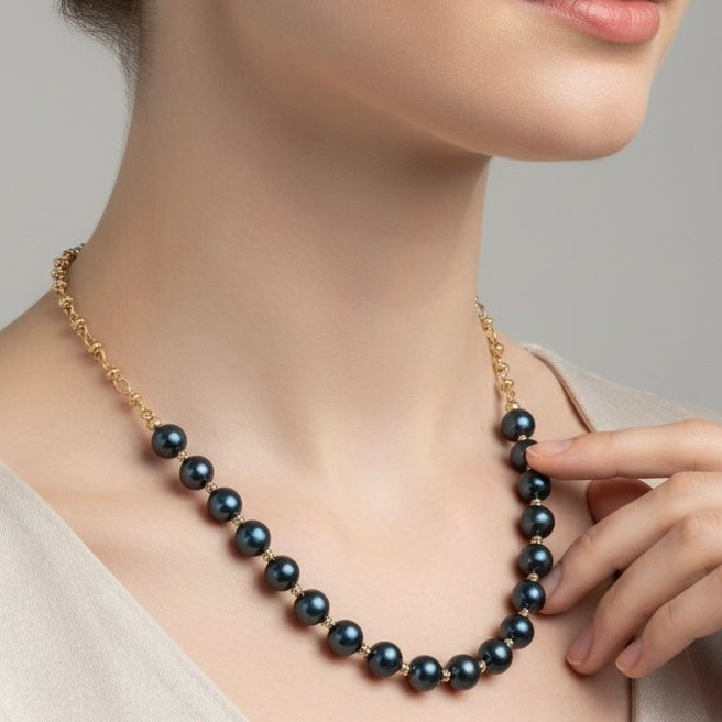 Élégant et profondément raffiné, ce collier de 45 cm sublime la lumière par l’éclat mystérieux de ses perles d’eau douce bleu nuit de 8 mm, aux reflets intenses et veloutés. Leur teinte profonde, presque céleste, évoque la douceur du crépuscule et confère à la pièce une présence à la fois sobre et magnétique.