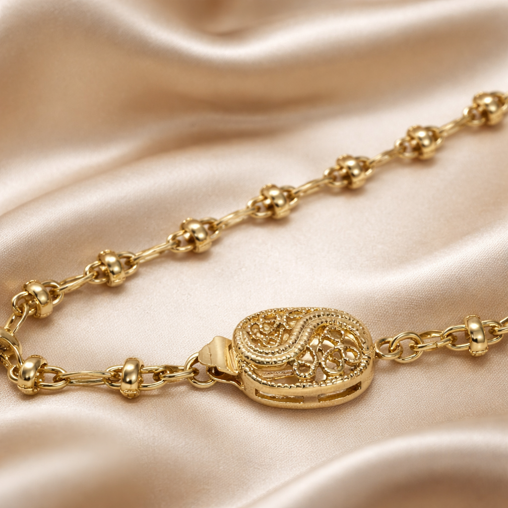 Chaque perle est délicatement séparée par des intercalaires plaqués or, apportant rythme et sophistication à l’ensemble, tandis que la chaîne plaquée or prolonge harmonieusement la composition avec finesse et légèreté. Le fermoir plaqué or ciselé, travaillé avec soin, signe le bijou d’une touche précieuse et artisanale, jusque dans les moindres détails.