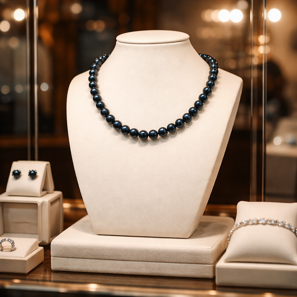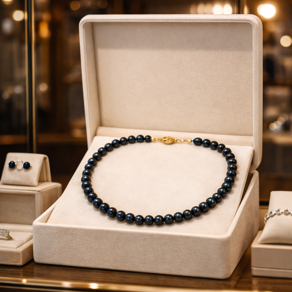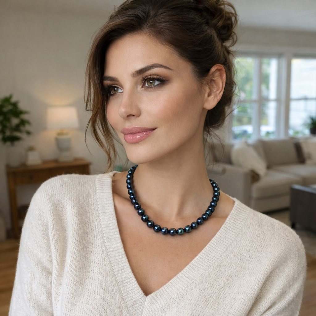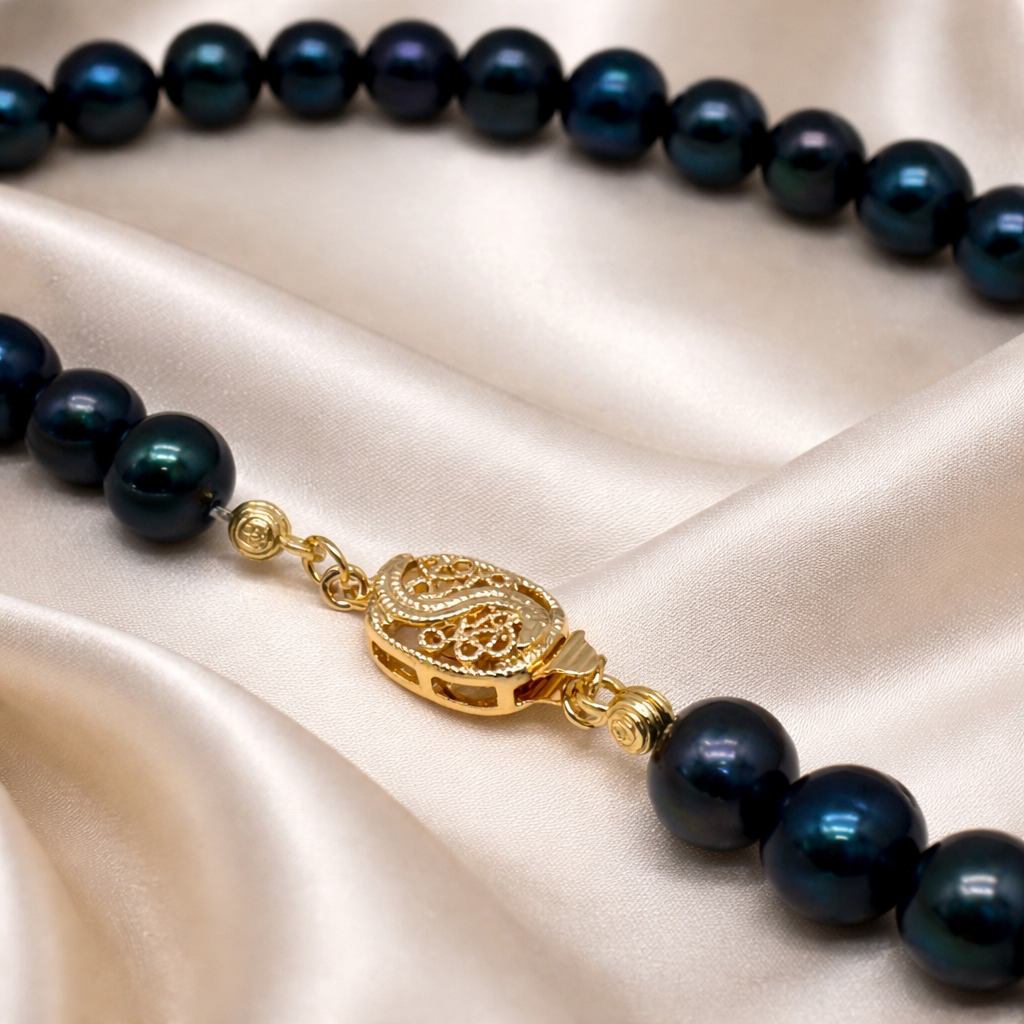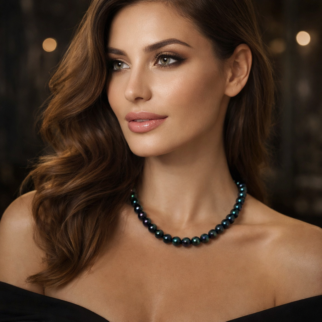 Il est composé de perles d’eau douce baroques, presque rondes, de 8 mm, soigneusement sélectionnées en qualité Triple A. Leur bleu foncé profond est magnifié par de superbes reflets irisés aux nuances paon et pétrole, offrant une lumière vibrante et sophistiquée à chaque mouvement. La taille de 8 mm apporte une présence affirmée tout en conservant une grande harmonie autour du cou.