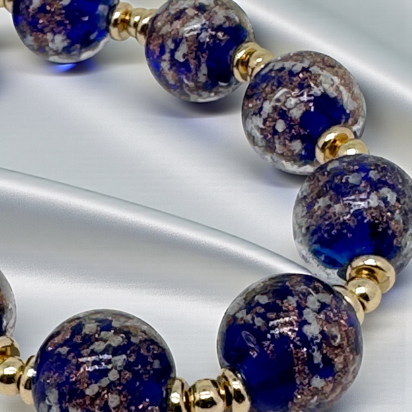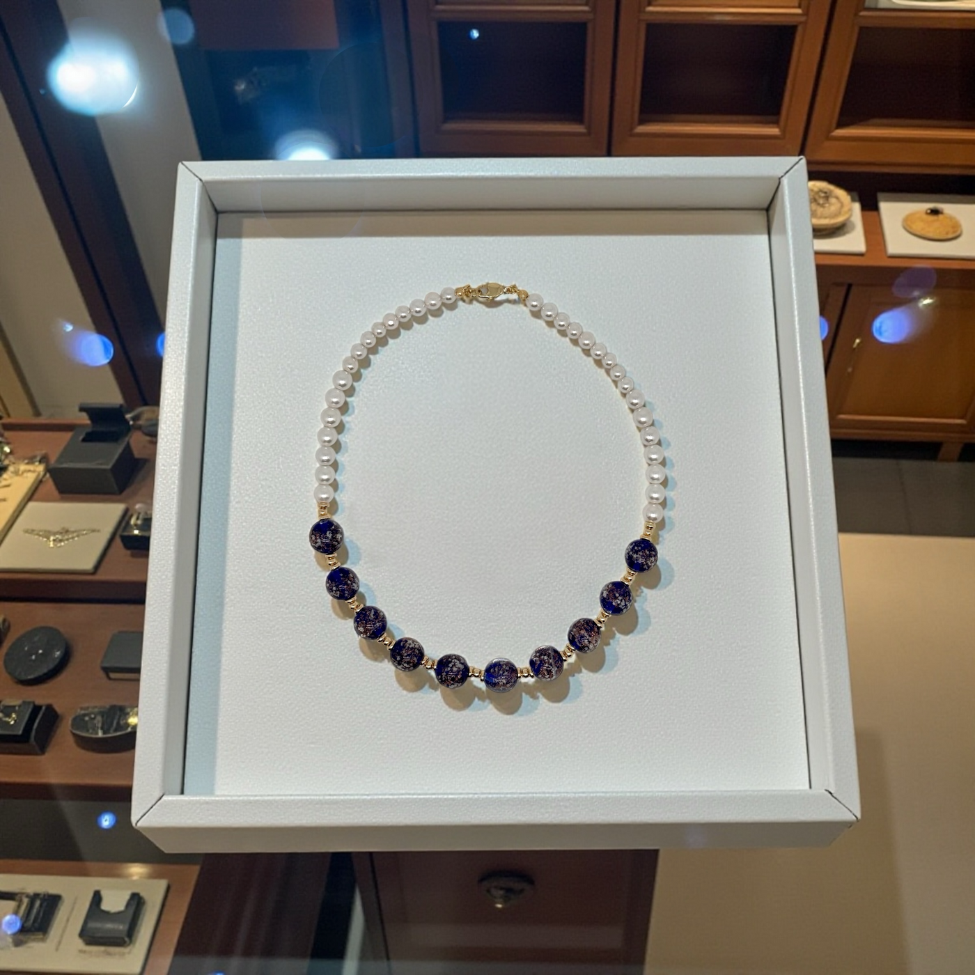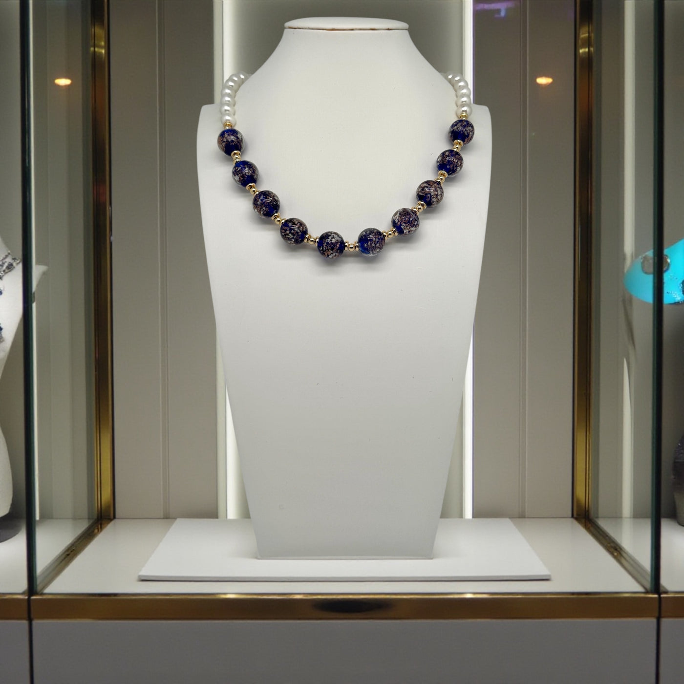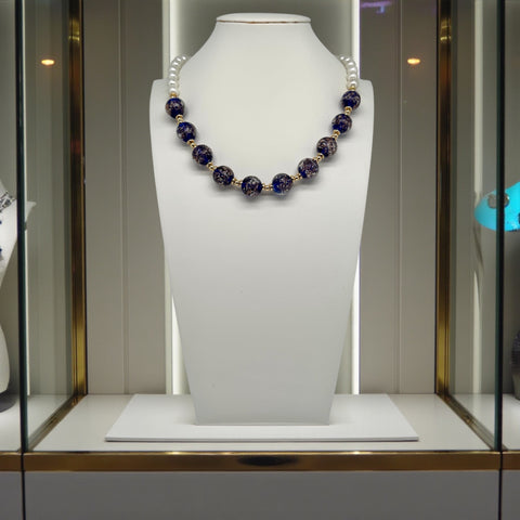 De délicates perles de coquillages de 6 mm, au lustre soyeux et nacré, épousent naturellement la ligne du cou. Leur éclat doux contraste avec la profondeur mystérieuse des 10 perles en verre, sublimées par de subtiles inclusions de paillettes d’or. Chaque perle capte la lumière comme une constellation précieuse, offrant un jeu scintillant à chaque mouvement.