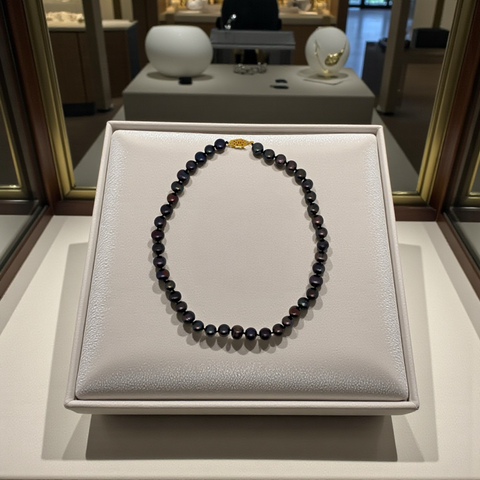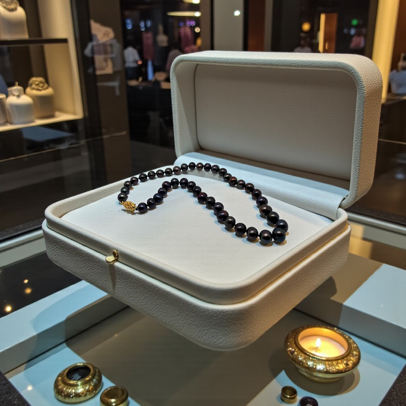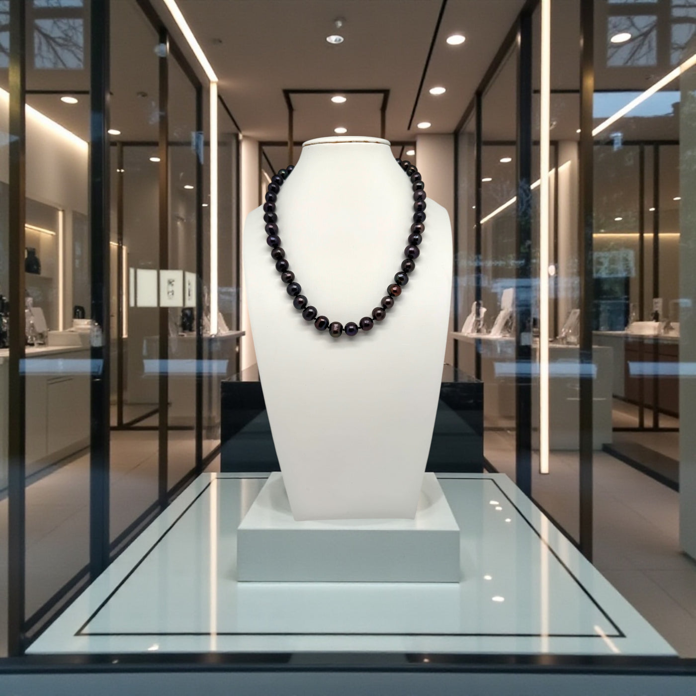 Élégant et intensément raffiné, ce collier de 40 cm se compose de somptueuses perles d’eau douce noires, soigneusement sélectionnées pour leur diamètre généreux de 9 à 10 mm. Chaque perle révèle un jeu de reflets profonds, oscillant entre le noir intense, les nuances mauves subtiles et des éclats gris soyeux, sublimés par un lustre exceptionnel, à la fois mystérieux et lumineux.