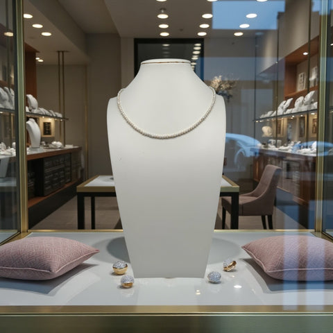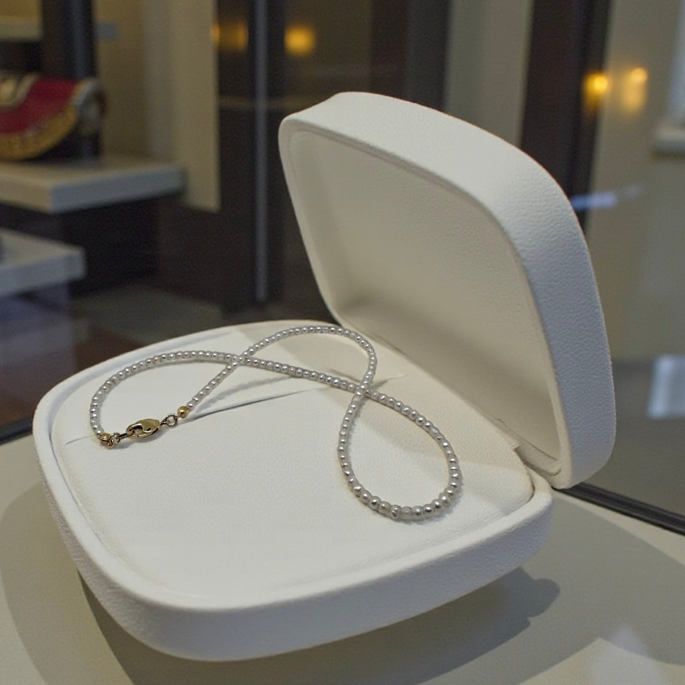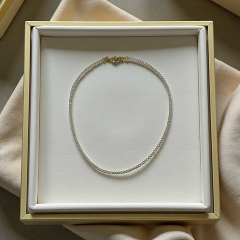 Épure absolue et sophistication naturelle définissent ce collier ras du cou en perles d’eau douce de 4 mm, sélectionnées pour leur éclat délicat et leur parfaite harmonie. Leur lumière nacrée, subtilement irisée, épouse le cou avec une élégance rare, tandis que le fermoir plaqué or apporte une finition précieuse et contemporaine.