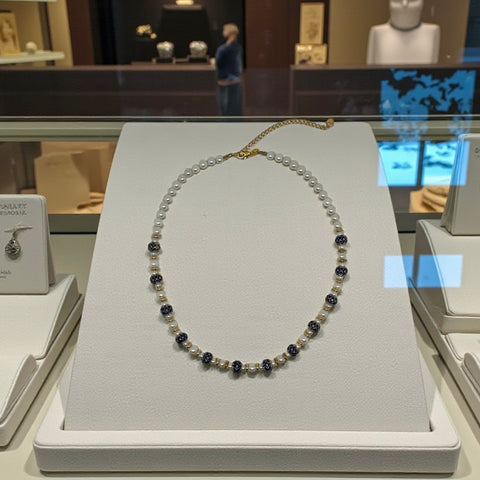 Laissez vous séduire par ce collier délicat et intemporel, composé de perles naturelles blanches de 6 mm, subtilement rehaussées de petites perles bleues en émail et d’intercalaires plaqués or. Sa longueur de 45 cm épouse parfaitement le cou pour apporter une touche de lumière raffinée, aussi bien au quotidien que lors d’occasions plus habillées.
