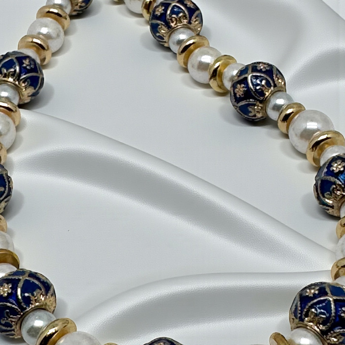 L’alliance du blanc nacré et du bleu profond évoque la pureté, la sérénité et une élégance douce, tandis que les finitions dorées apportent une note chaleureuse et précieuse.