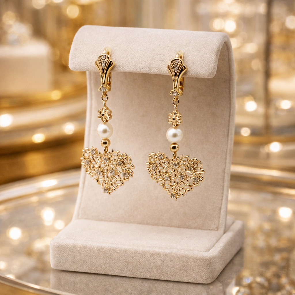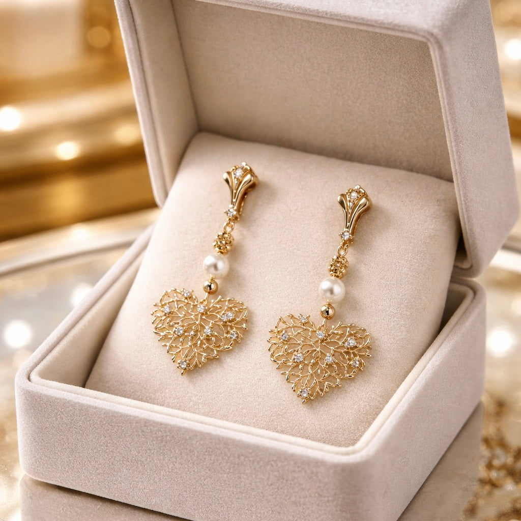 Délicatement plaquées or, elles se distinguent par un somptueux cœur ajouré finement travaillé, sublimé par l’éclat discret du zirconium. Une perle de coquillage apporte une touche de douceur et de lumière, créant un contraste harmonieux entre sophistication et féminité.